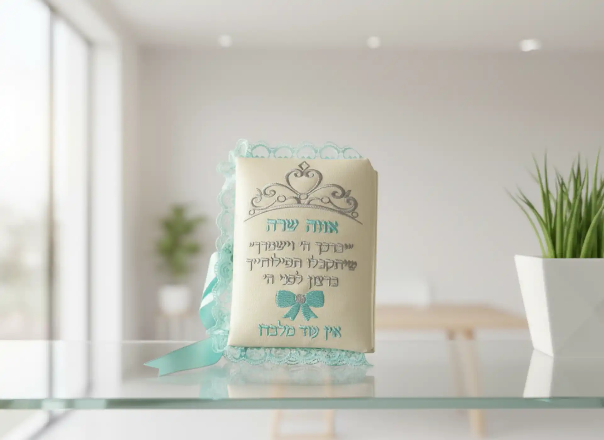 סידור לאשת חיל/ בת ישראל. עם כל התפילות לנשים כולל תהילים! הסידור עטוף בד דמוי עור עם רקמת שם אישית (עד 3 מילים). ניתן לבחור את צבע הרקמה. הסידור בגודל סטנדרט 17 על 12 ס"מ. בנוסח עדות המזרח.