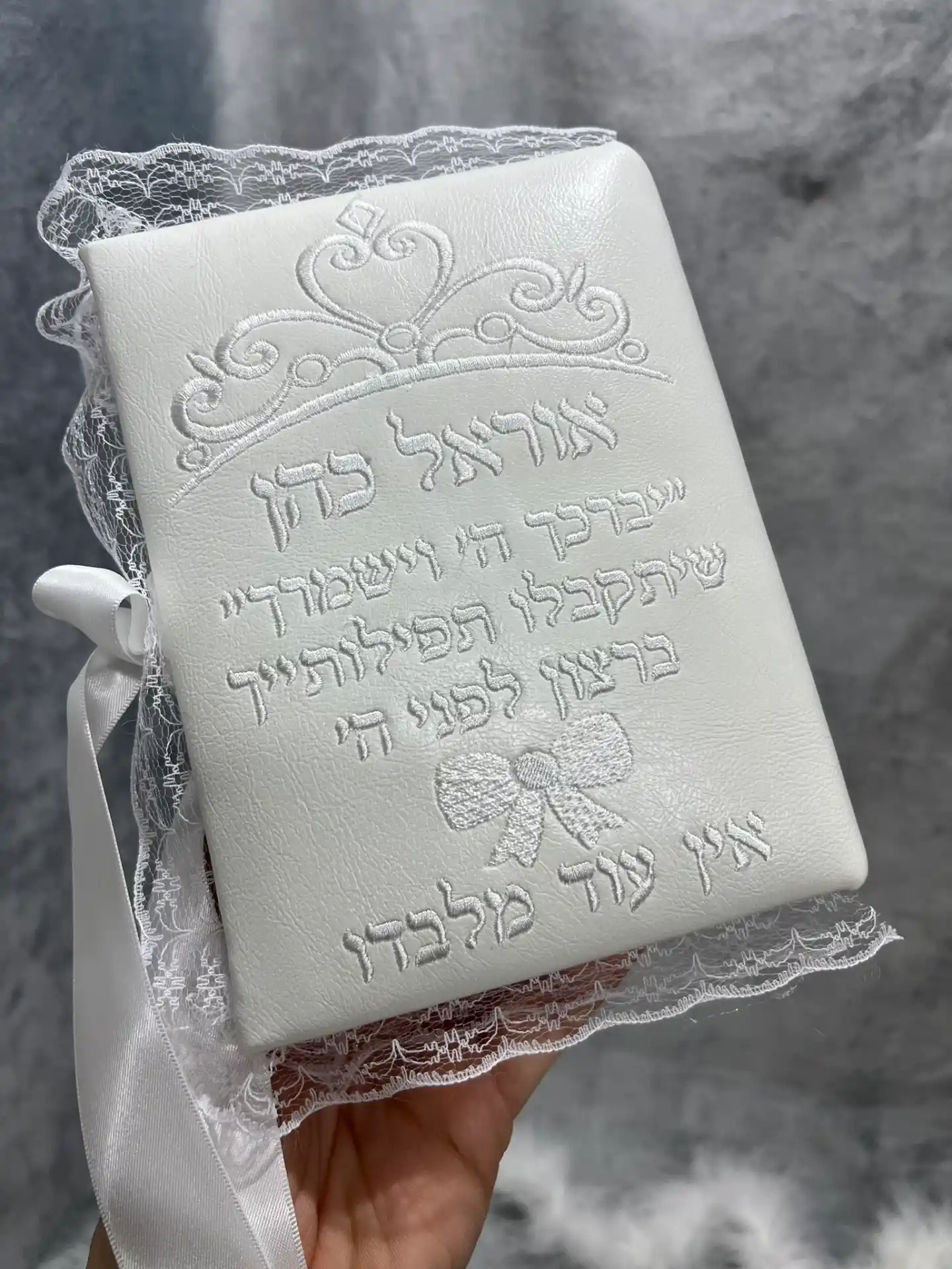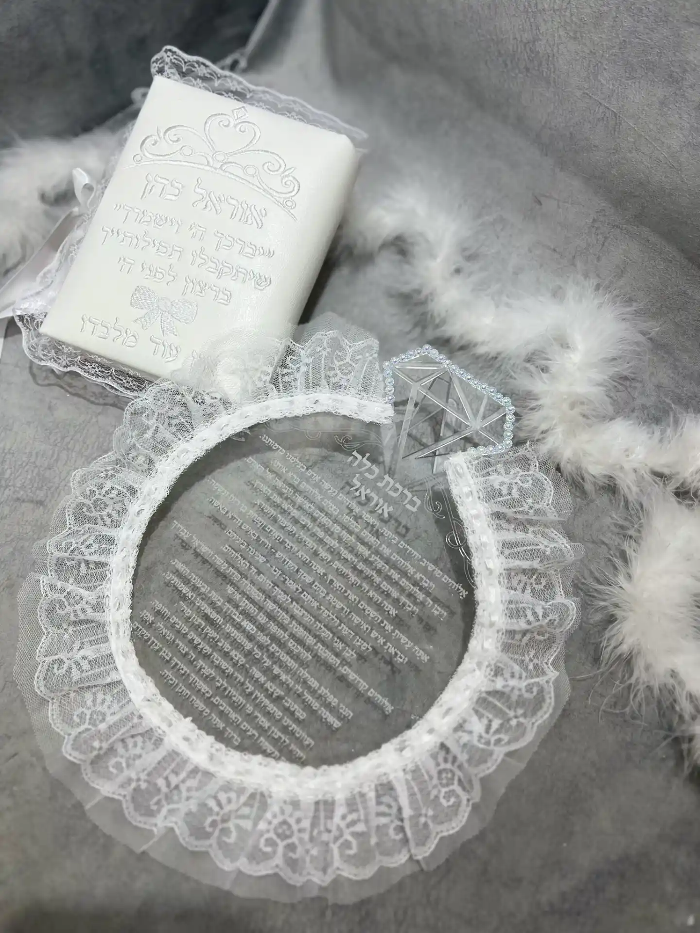 ערכה מושלמת לכלה – סידור וברכת כלה. הסידור עם כל התפילות לנשים כולל תהילים!  עטוף בד דמוי עור עם רקמת שם אישית (עד 3 מילים).בגודל סטנדרט 17 על 12 ס"מ. בנוסח עדות המזרח. ברכת כלה בצורת יהלום משובצת אבנים ,בחריטה אישית על גבי פרספקס אקריל בעובי  4 מ"מ ברוחב 19 ס"מ בגובה 23 ס"מ . ניתן להוסיף שם ותאריך.